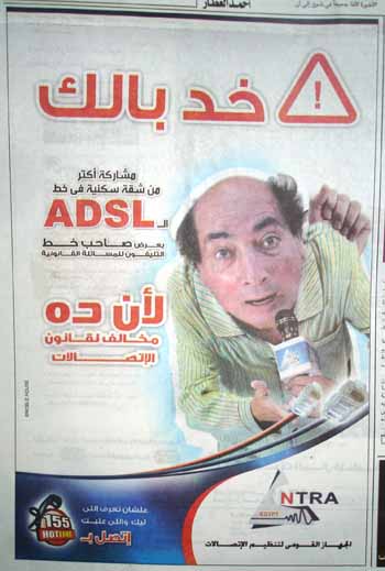 قاغد في اجتماع مع أربعين من المهتمين باستخدام اللاسلكي لنشر استخدام الانترنت في أفريقيا، و في وسط المناقشات اللي عن الشبكات الشعبية و العضوية ألاقي الاعلان ده عند وائل عباس