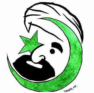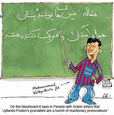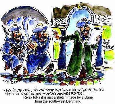 This one is unfortunate, especially because it probably depicts many danes idea of what the middle east looks like. Dark-skinned, bearded men with crescent-shaped knifes and women dressed head-to-toe in black. But perhaps it was actually meant as a sarcastic comment on the whole idea of depicting mohammed? An extreme stereotype as a way to illustrate the stupidity of the typical stereotype? One can always hope. Basically it is important to undewrstand that much of danish humour is based on depicting extremely exaggerated stereotypes. Of unemployed drunken danes, of the royal family, of rich people in their villas along the coast north of copenhagen, of farmers, and city-boys, and also of immigrants and foreigners. Sarcasm and exagerated stereotypes are all anyone ever laughs at here. In some ways for this picture I could find an explanation for what the artist was thinking, and why he came up with the design he did that isn't evil or vile. If he was drawing something, and wanted to illustrate how silly prejudice and stereotypes can be, perhaps that is exactly the drawing he would draw. And the same artist might draw a danish tourist as a bumbling viking heading to ibiza to rape and pillage, or even draw jesus as a crusader. I am not sure that this is actually what the artist was thinking, but one of my favourite quotes, is also one of my basic rules of life: "Never attribute to malice what can be adequately explained by stupidity." - Nick Diamos