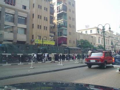 It started ok...me, Alaa, Mostafa and professor Laila Soueif arrived near Lazoughly square at 4:30, Mostafa droped us, with the banners and the boxes and left to park his car away. We met Isis and walked to the square. This time there were many "Amn Markazy" cars many police officers unlike the last demonstration in shubra. We arrived found that the amn is surrounding the mozahra on the pavement in front of "Gad" Sandwiches shop but with loose forces. We went in and started distributing the banners.
